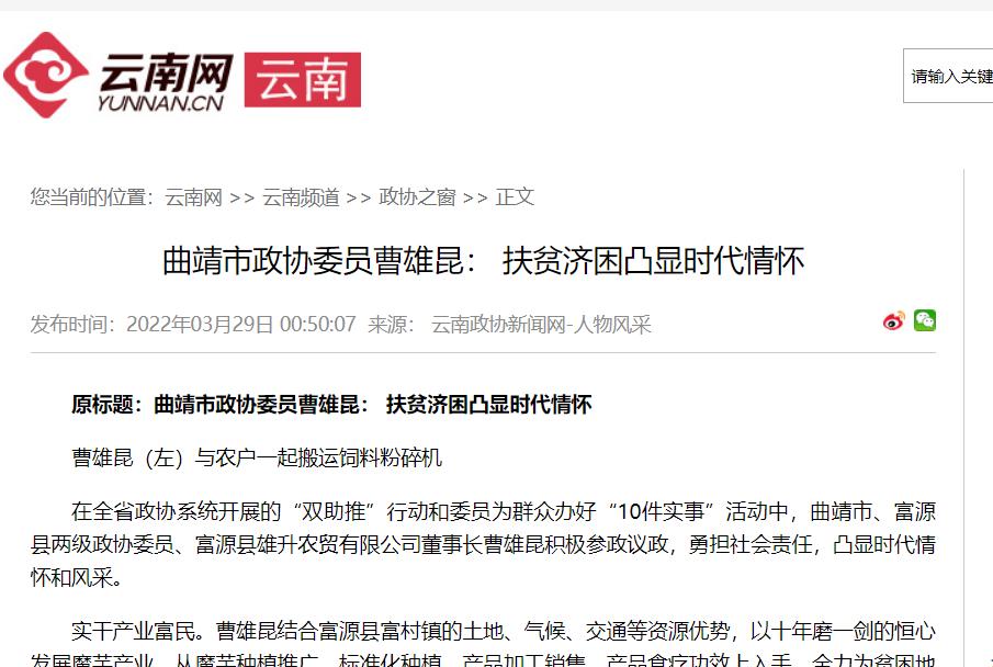 云南網報道:原標題《曲靖市政協(xié)委員曹雄昆: 扶貧濟困凸顯時代情懷》